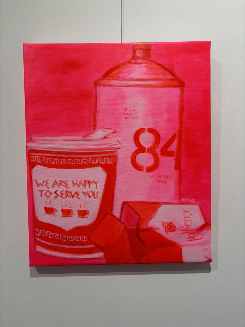 A still life painting capturing several items including a Moontana spray can, a New York coffee cup, and a pack of Mulberry cigarettes.